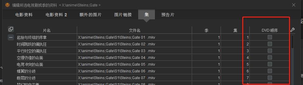 如果不想折腾改名,可以直接双击番名文件夹,然后在集的选项卡里面将文件的DVD顺序全部打上勾,这样就不刮削单集但是会将这些文件识别为这个番下属的剧集。