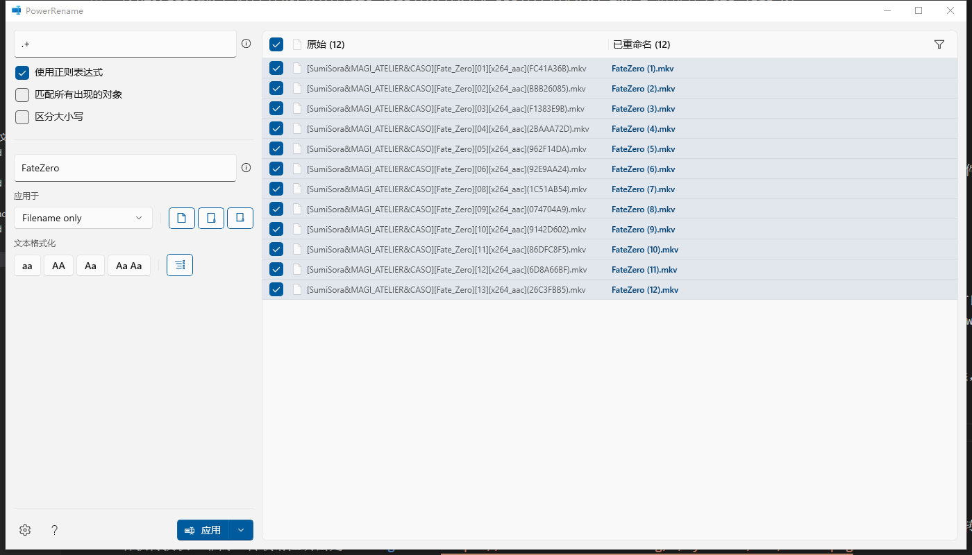 搜索中输入.+,替换为输入番名,应用于选filename only,勾选文本格式化的枚举项,再点击应用,得到类似如下效果